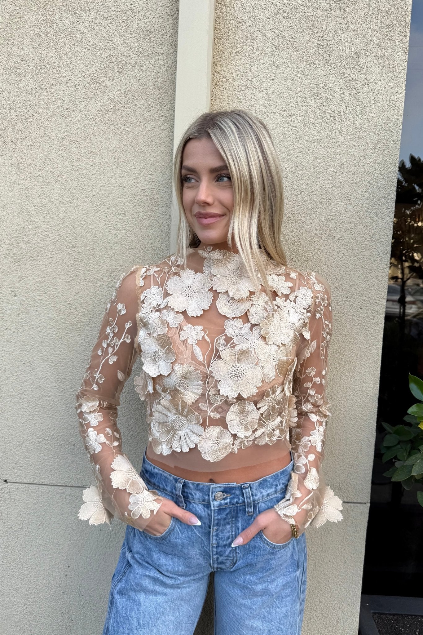 PETALENE TAUPE EMBROIDERY FLORAL TOP